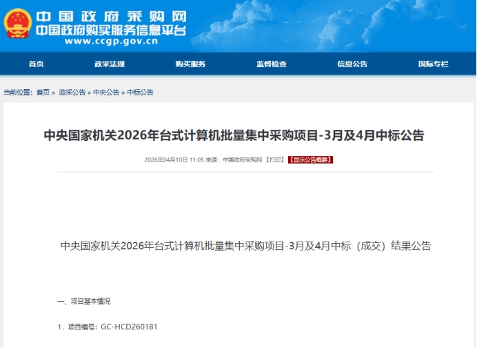 4月10日,中央国家机关公布了3月和4月的台式机批量集采结果。本次采购总预算达到810万元,五个配置包全部中标,无一流标。今天我们就来拆解这份刚刚出炉的央采台式机公告所隐藏的一些背后逻辑和趋势!