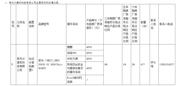 首先我们来看下中标金额,此次紫光计算以333.76万元位居第一,单价4930元,中标数量达677台,占据本次采购总量1620台的41.8%,成为本轮央采的最大赢家。
