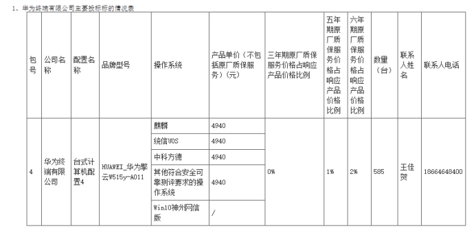 另外,华为终端以288.99万元位列第二,产品单价4940元,中标数量585台。与紫光仅差不到6个百分点。华为擎云W515系列继续走ARM路线。